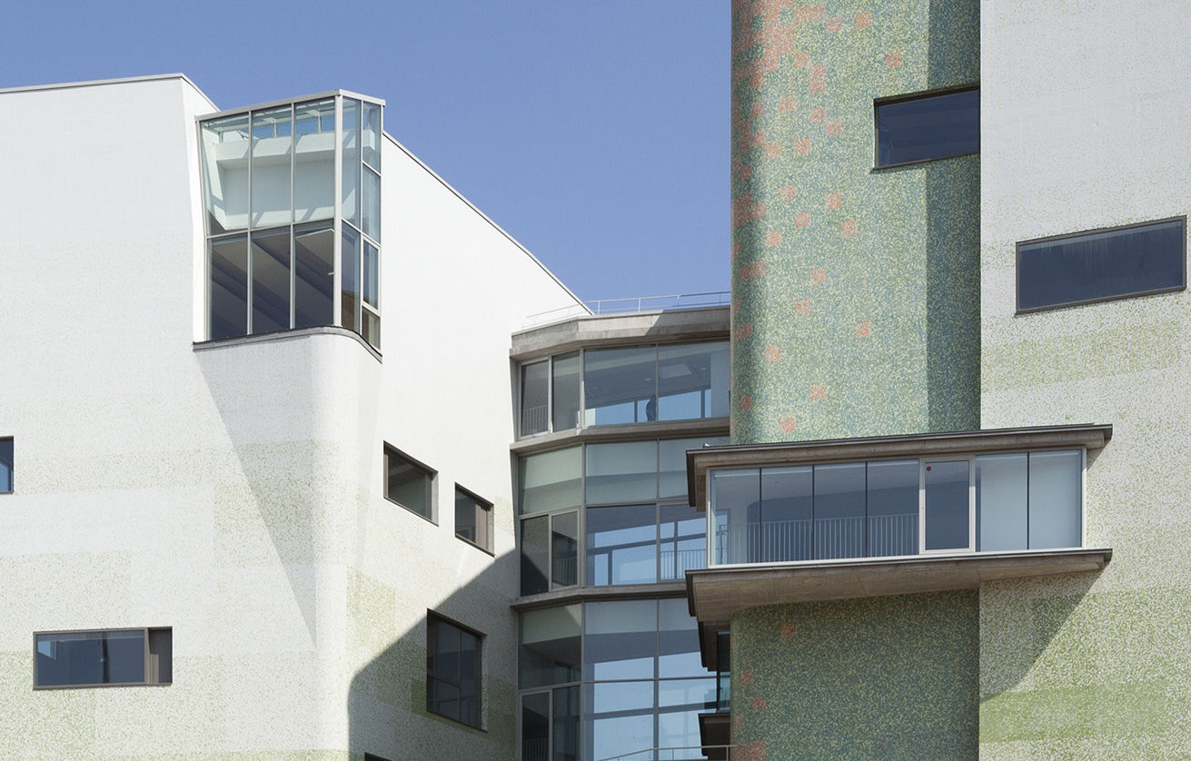 Située au cœur de la parcelle, la partie conservatoire échappe à la contrainte de hauteur maximale (25 mètres) et se déploie verticalement, en direction de la lumière, des vues dégagées et des arbres de la place Stalingrad. Cette disposition permet de superposer les différents espaces pédagogiques.