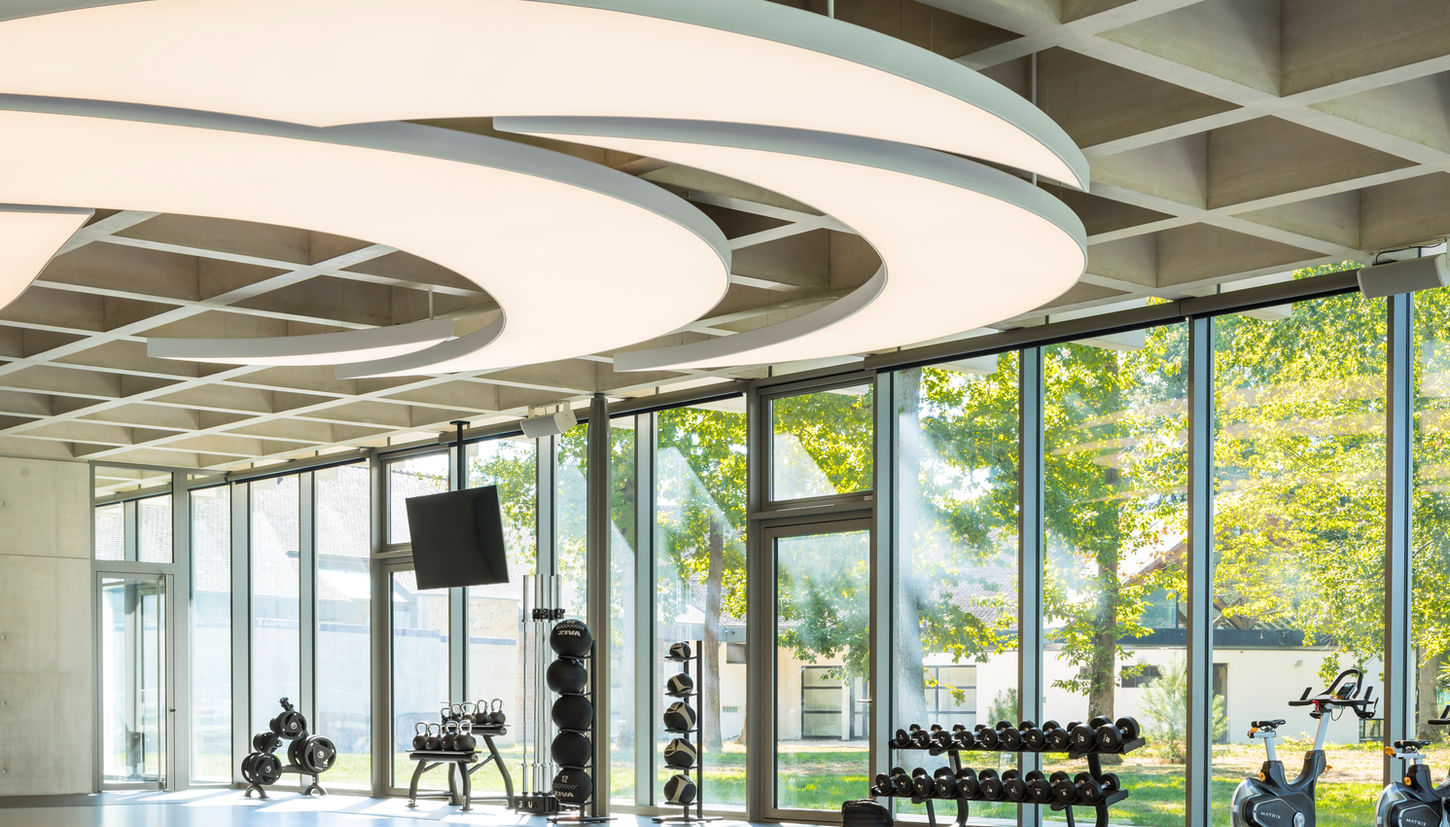 La volumétrie est sobre : un parallélépipède clair, sans emphase. Les façades dialoguent avec le paysage, laissant entrer la lumière tout en filtrant les vues, pour que l’on demeure « dans la nature ». L’espace intérieur conjugue rigueur fonctionnelle et confort sensoriel, dans une clarté qui met le geste athlétique au premier plan.